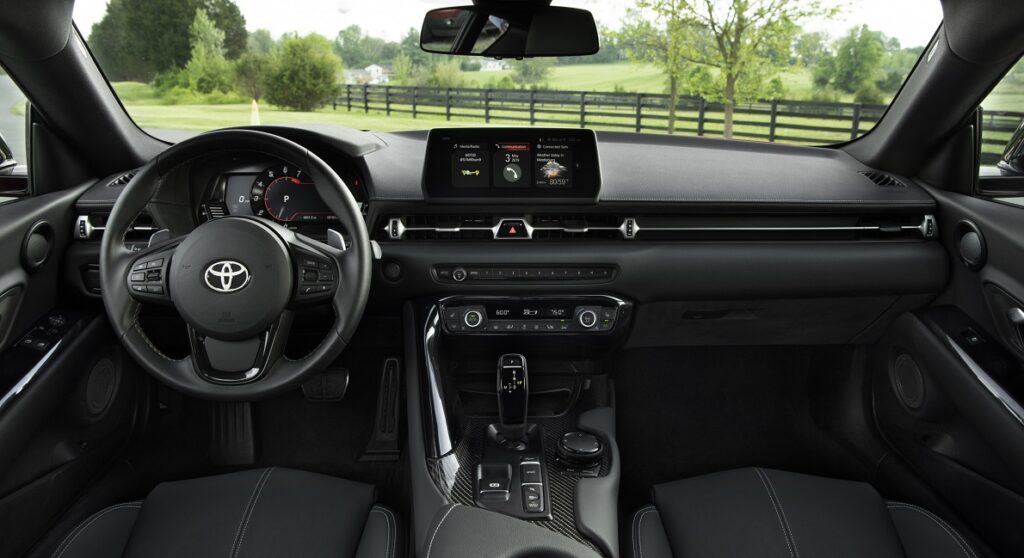 Las ya increíbles características de Supra siguen siendo estándar, incluida una agresiva transmisión Z-F8 de ocho velocidades con levas de cambio, suspensión deportiva variable adaptable y diferencial deportivo trasero activo, y frenos delanteros Brembo con pinzas rojas y el logotipo plateado de Toyota Supra de serie.