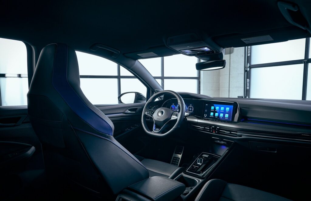 El guiño sutil pero deliberado al rendimiento continúa en el interior, donde el panel de instrumentos y la moldura de la puerta delantera cuentan con inserciones decorativas de fibra de carbono genuinas por primera vez en un vehículo Volkswagen de producción.