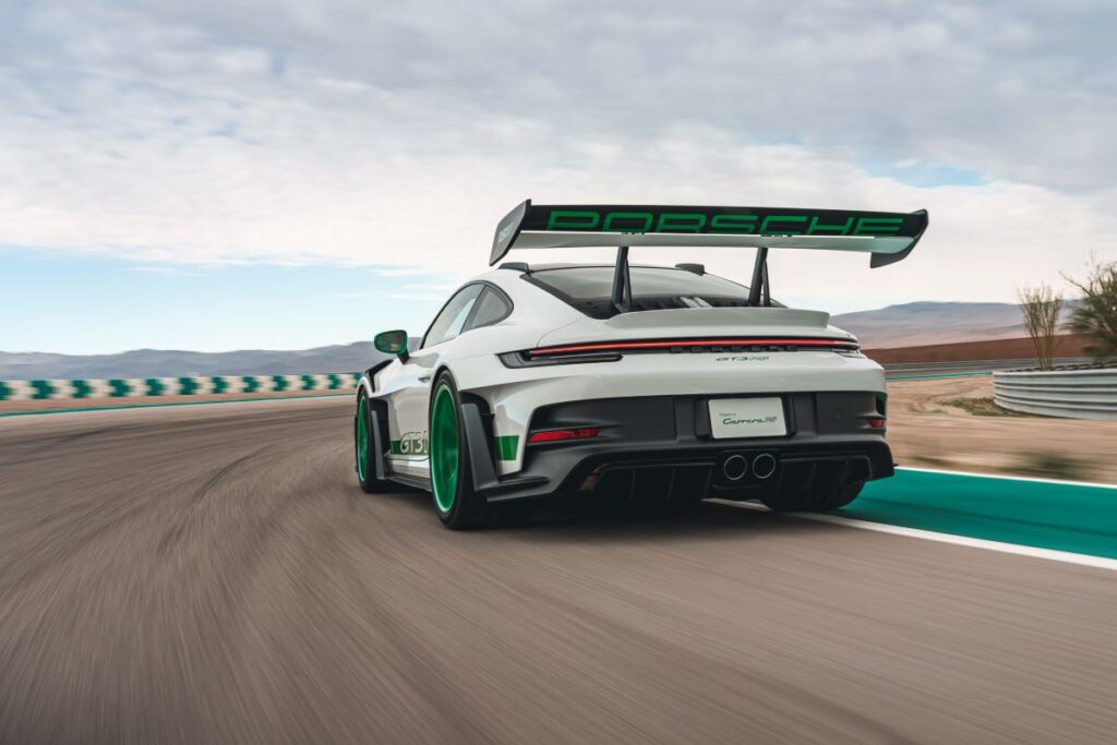 La inscripción PORSCHE en la parte inferior del alerón y un gráfico GT3 RS en el parachoques trasero continúan con el tema, que se completa con un logotipo RS especial en las placas finales del alerón con la bandera estadounidense.
