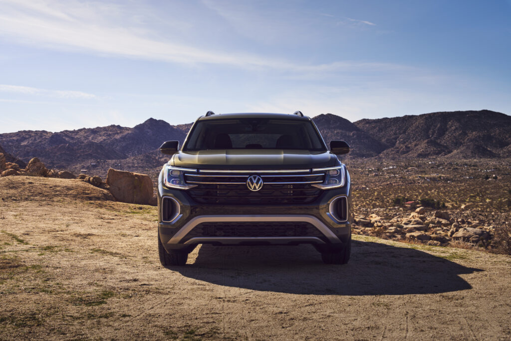 El frente de los modelos Peak Edition se destaca de inmediato de otros modelos Atlas con una fascia delantera resistente y un revestimiento debajo de la carrocería en plata. Un elemento de diseño en forma de “X” en negro brillante se extiende a lo largo de la fascia inferior, tomado de Atlas Cross Sport. Dos tiras cromadas aparecen en una parrilla oscurecida que fluye a ambos lados del logotipo iluminado.