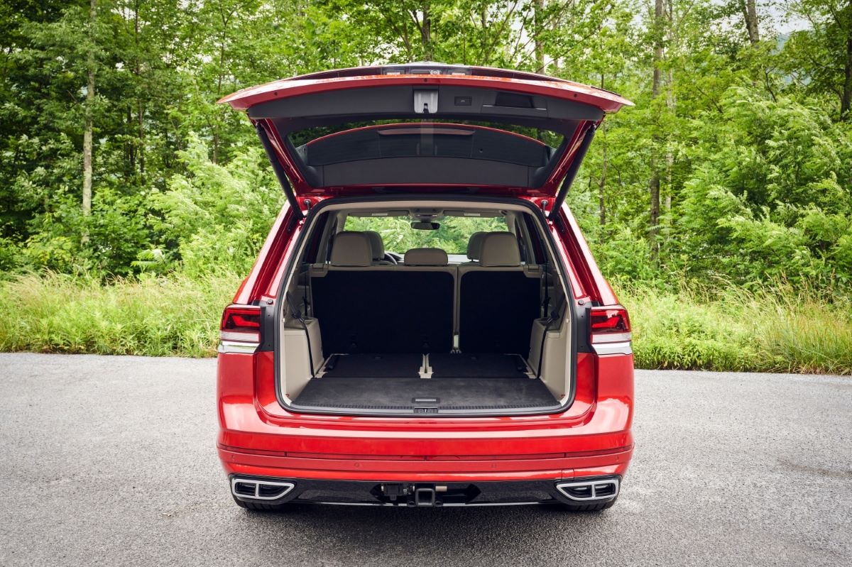 El Atlas tiene un volumen de carga máximo de 96.6 pies cúbicos detrás de los asientos de la primera fila cuando todos los asientos traseros están plegados. Con solo la tercera fila plegada, la capacidad de carga es de 55.5 pies cúbicos y con todos los asientos levantados, la capacidad de carga es de 20.6 pies cúbicos.