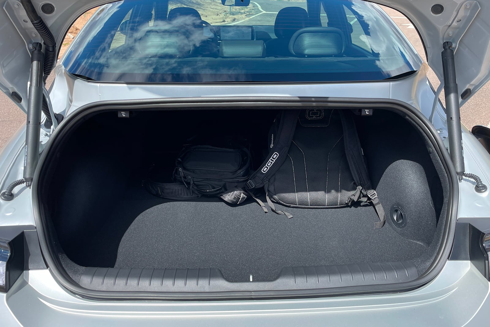 El Ioniq 6 tiene sólo 11,2 pies cúbicos de espacio en su maletero. Pero al hacer realizar una prueba de equipaje, tanto en el Ioniq 6 como en el Model 3 cabía más o menos la misma cantidad. No hay espacio de almacenamiento bajo el piso como en el Tesla y el maletero no es muy ancho, aunque sí profundo.