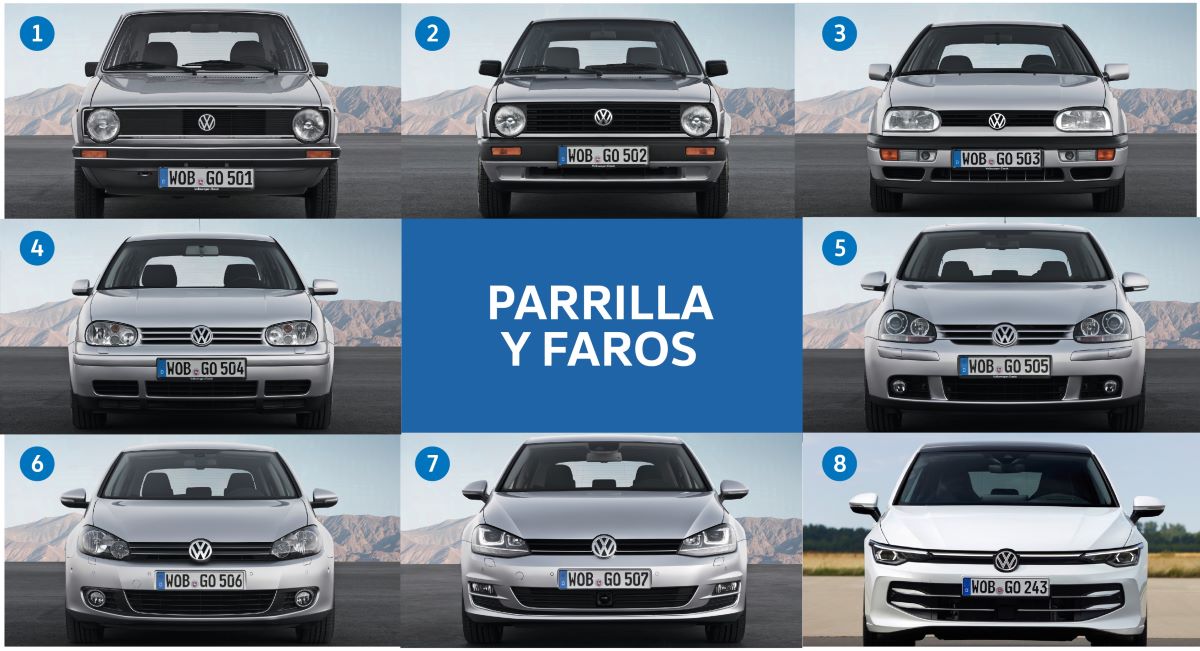 Ese esquema básico, con la posición baja del frontal, como punto de convergencia del inclinado capó y la línea central de cintura; y una parrilla continua con elementos negros y la insignia central de VW entre los dos faros, se ha mantenido en todas las generaciones del Golf.