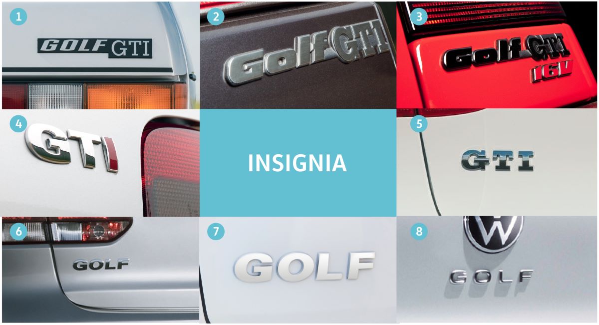 Las insignias que el Golf y la versión GTI han lucido en su carrocería y en el interior también han sido una de sus señas de identidad y una muestra de la evolución del diseño de este modelo. El diseño y tipografía de la palabra “Golf” del modelo original solo se empleó en la primera generación.