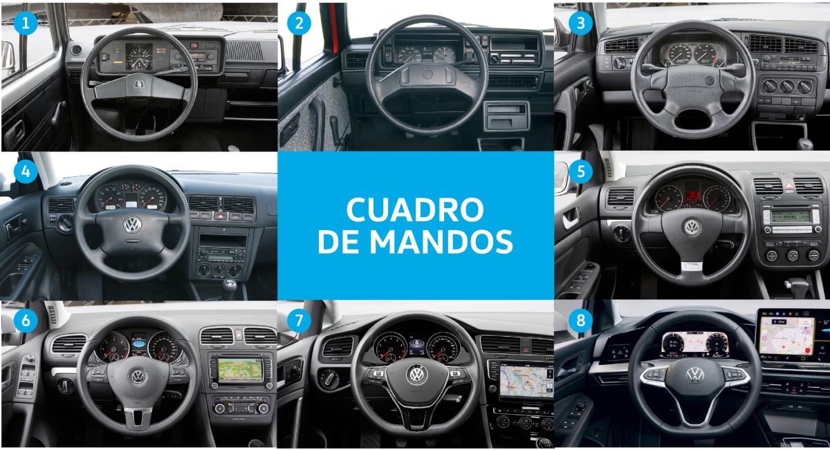 Cincuenta años separan los elementos básicos del primer Golf (velocímetro, nivel de combustible, mando de luces, testigos básicos, radio y ventilación), con la actual vanguardia tecnológica, con un Digital Cockpit con pantalla de 10,2 pulgadas y el sistema de info-entretenimiento de nueva generación equipada con la inteligencia artificial (IA) de ChatGPT.