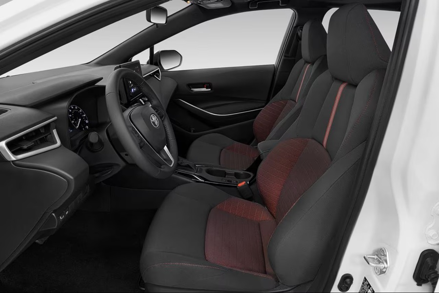 Los asientos deportivos tapizados en tela SofTex incluyen ajuste manual en seis direcciones, diseño con mayor contorneo lateral y bordados decorativos, ofreciendo soporte adecuado aunque carecen de calefacción, ventilación o ajuste lumbar incluso como opción en el SE.